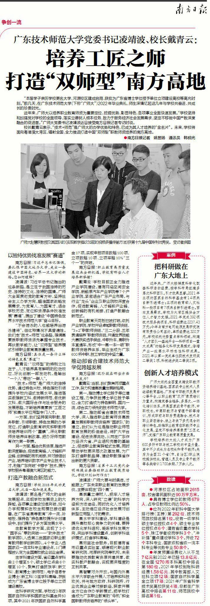 6月26日,《南方日报》记者采访我校党委书记凌靖波、校长戴青云,以《培养工匠之师 打造“双师型”南方高地》为题,深度报道我校培养工匠之师,打造“双师型”南方高地的工作成效与发展规划。现官网予以全文转载,供师生们学习。