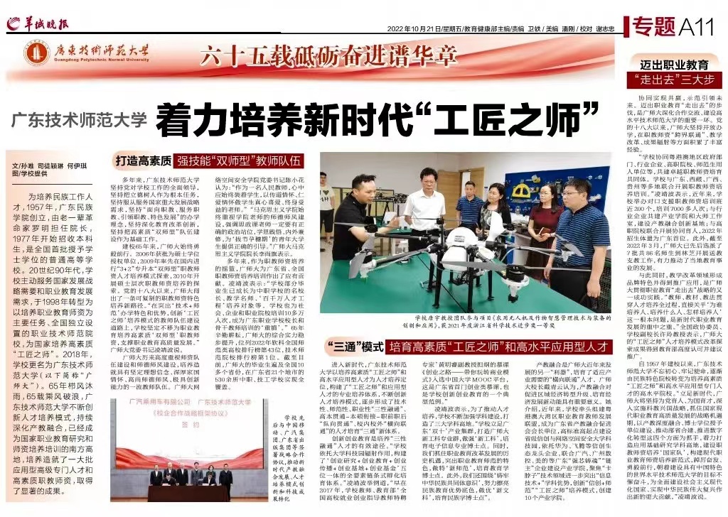 10月21日,《羊城晚报》A11版以《广东技术师范大学:着力培养新时代“工匠之师”》为题,对我校65年栉风沐雨,65载乘风破浪,不断创新人才培养模式,持续深化产教融合,贯彻落实立德树人根本任务进行了专题报道。