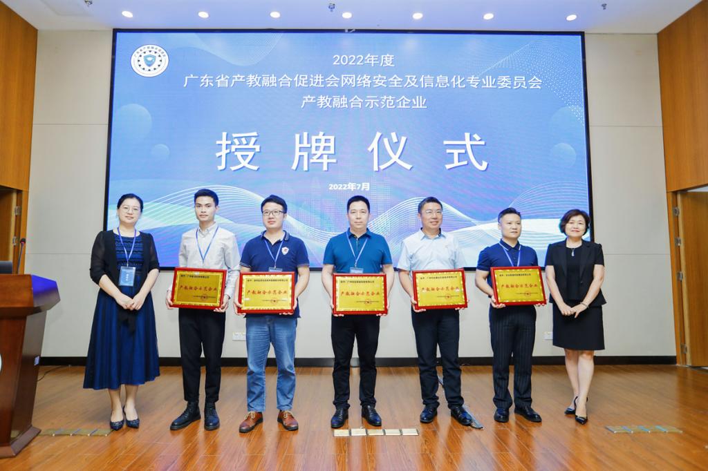 研讨会上,广东省产教融合促进会为表达会员企业对产教融合工作辛勤奉献的肯定,特举行了产教融合示范企业授牌仪式,奇安信科技股份集团有限公司、广东昱辉通信技术有限公司、麒麟软件有限公司、广州创显科教股份有限公司、分之道(广东)信息技术科技有限公司、云达信息技术有限公司、广州培生智能科技有限公司、广州星溪科技有限公司、启明星辰信息技术集团股份有限公司、华云数据控股集团有限公司、广州中长康达信息技术有限公司、广东亿迅科技有限公司等企业荣获“2022年度广东省产教融合促进会网络空间安全及信息化专业委员会产教融合示范企业奖”。