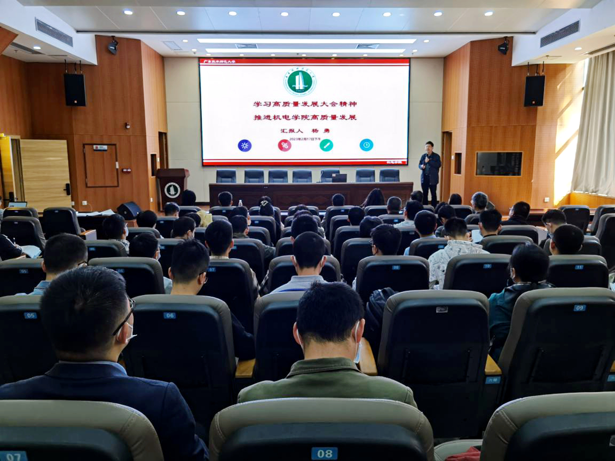 会上,院长杨勇作《学习高质量发展大会精神,推进机电学院高质量发展》专题报告,指出在传统制造模式向智能制造转型升级的关键阶段,创新人才培养模式,是适应新制造、新模式、新业态等突变的唯一出路!机电学院应聚焦广东“双十”产业集群高质量发展和高水平职教师资紧迫需求,构建集基础研究、技术开发和产业应用等于一体的机械工程重点学科专业提升模式,搭建机器人与智能制造产业学院平台,做好产教融合的增量,打造具有一定影响力的机械工程、机器人工程、智能制造、工业设计软件等特色重点学科方向,聚力培养卓越工程师和卓越职教师资,助力广师大博士点和新工科硕士点建设,服务粤港澳大湾区的高质量发展。